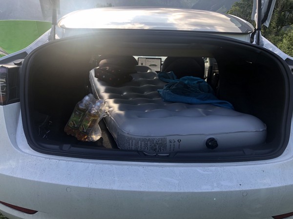 Brief stop at a high-power charger in Thusis, Switzerland. Gotta love the Model 3’s CCS compatibility.After some shenaningans with fully-booked camping grounds, we finally arrived at a place in Grindelwald that had room to spare. The Model 3 has been promptly upgraded to a “small mobile home” alongside the S-Max, and I got to try sleeping in it for the first time.This worked better than expected. Next time I need a thinner mattress to allow my knees more than an inch of room before hitting the shelf above the trunk, but otherwise it was really nice. Having the heater run through the night definitely added some comfort, since the temperature dropped to below 10° before morning - fellow travelers in their tents were slightly jealous.