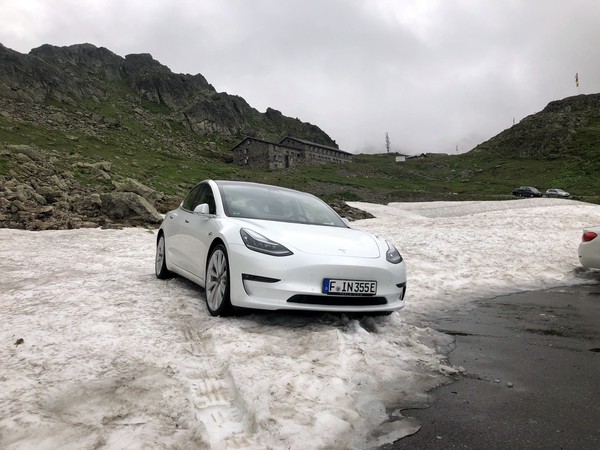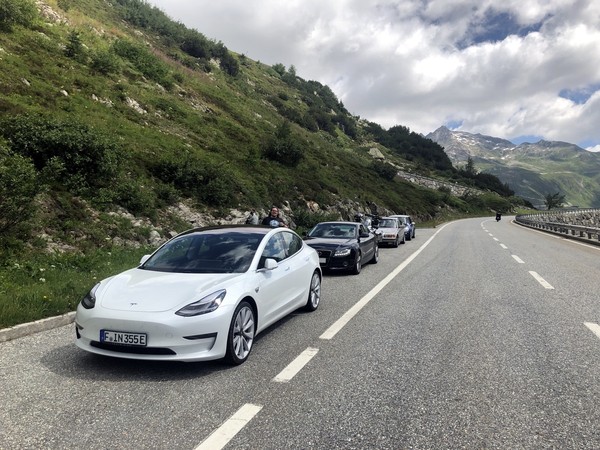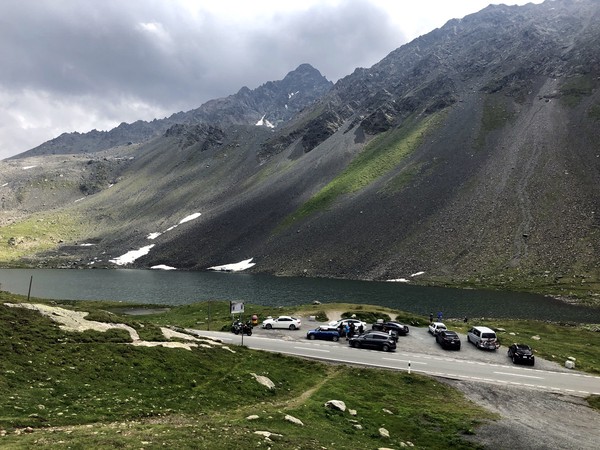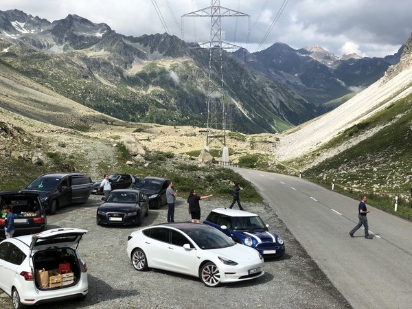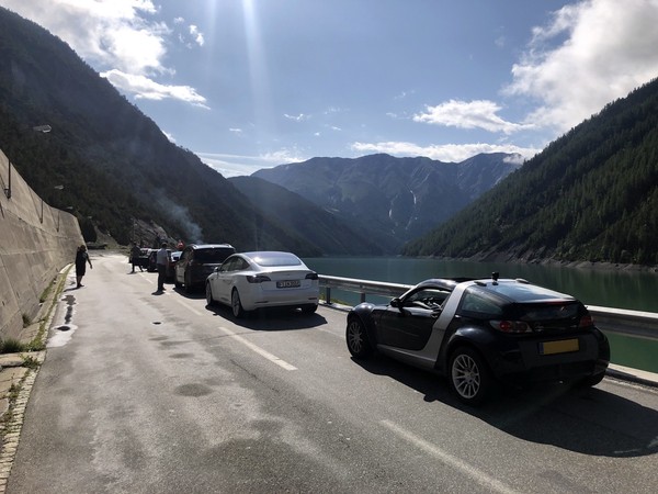 On Day 2 we exited north out of Livigno, across the border tunnel into Switzerland, and headed west towards the Swiss lakes. But only after waiting in queue before the tunnel, which is single lane and alternates direction every 15 minutes or so. Another car from our group: a British Smart Roadster Coupé.Having enjoyed some swoopy Swiss roads while keeping strictly to the speed limit (speeding in Switzerland is expensive), we briefly stopped on the Albula pass. Yet another car from our group can be seen here: the Audi A5 3.0 TDI from Slovenia.And after climbing the Susten pass, we even found some snow on the side of the parking lot. Of course I had to test the electric all wheel drive here. Safe to say, despite wearing summer tires (factory Michelin PS4S) it got further up there than any other vehicle in the group, including the Quattro-equipped Audi and some much lighter cars :)
