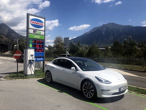 Day 1 route headed west from Falcade towards Trento, before climbing into the mountains and turning north-west, ending in Livigno behind the picturesque Foscagno pass.One of very few Tesla Superchargers that I used on the trip, near Trento. Located next to the highway in an industrial area, at least there’s a hotel with facilities and a snack bar to spend the short recharge time before moving on.