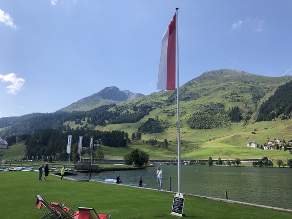 Skipping the blocked-off rest of the Spluga pass, on Day 6 we headed down the valley road instead, then east into Switzerland towards St Moritz, turning north to Davos and finally further east back into Italy, with a short bit of Austria in between where everywhere except me got cheap fuel.When we arrived in Davos, the weather first had caught up with us, but cleared again very quickly. We had some lunch at the lake.Meanwhile the car was again topped off at a 50kW CCS charger. This one was annoying though - wouldn’t accept any of my RFID cards, only wanted direct contactless payment… but none of my debit or credit cards would work either, since they’re all setup to require PIN for all payments (including contactless), while the bloody thing had no PIN entry buttons -.- Ultimately one of the fellow roadtrippers paid for it with his phone.