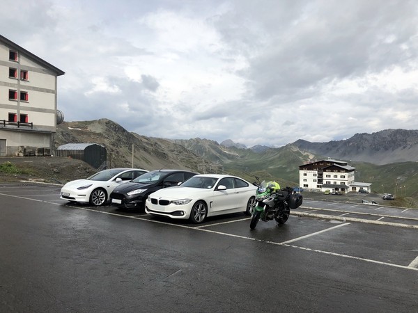 And a good decision it was. The very bottom of Stelvio was very wet and foggy, but it cleared up as we climbed. And the weather seemed to have caused the traffic to be much lighter than usual.The small group that decided to make the climb: the Tesla, Fiesta ST, British 4-series, and a very Finnish bike rider who organized the whole thing. He has my utmost respect for sticking through the whole thing on a bike…